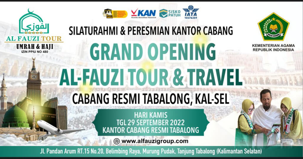 Peresmian Cabang travel haji dan umroh Al Fauzi Group ini memberikan hadiah umrah kepada salah satu Tahfiz Qur’an ananda Irham. Adapun lokasi travel tersebut berada di Jl. Pandan Arum RT 15 No. 20, Belimbing Raya, Murung Pundak, Tanjung Tabalong, Kalimantan Selatan.