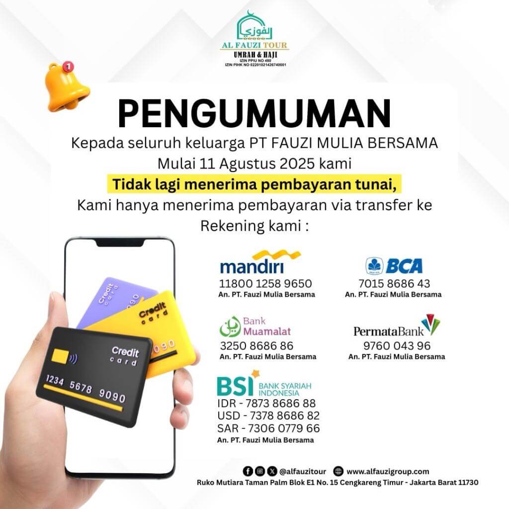 Al Fauzi News | Seluruh transaksi pembayaran untuk layanan di Al Fauzi Tour hanya dilakukan melalui transfer bank ke rekening resmi perusahaan atas nama PT. FAUZI MULIA BERSAMA. Kami tidak lagi menerima pembayaran dalam bentuk tunai (cash) dengan alasan keamanan, transparansi, dan akuntabilitas. Semua pelanggan diharapkan melakukan pembayaran hanya melalui saluran perbankan resmi yang telah kami tentukan.