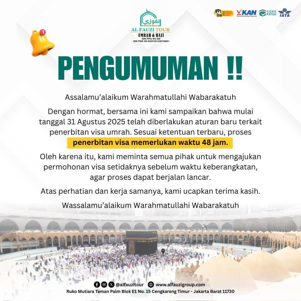 Al Fauzi News | Mulai 1 September 2025, Pemerintah Arab Saudi akan memberlakukan kebijakan baru terkait penerbitan visa umrah. Setiap visa umrah kini memerlukan waktu tunggu minimal 48 jam setelah mendapatkan persetujuan dari sistem. Langkah ini diambil guna meningkatkan ketertiban proses administrasi dan memastikan kelayakan jemaah sebelum berangkat.