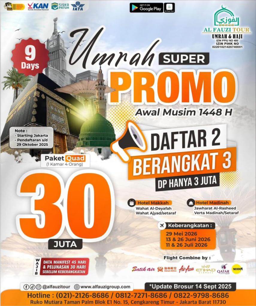 Al Fauzi Tour kembali menghadirkan Umrah Super Promo Awal Musim 1448 H dengan penawaran istimewa yang sayang untuk dilewatkan! Khusus paket 9 hari, Anda bisa mendapatkan harga hemat hanya Rp30 juta untuk Paket Quad (1 kamar 4 orang).