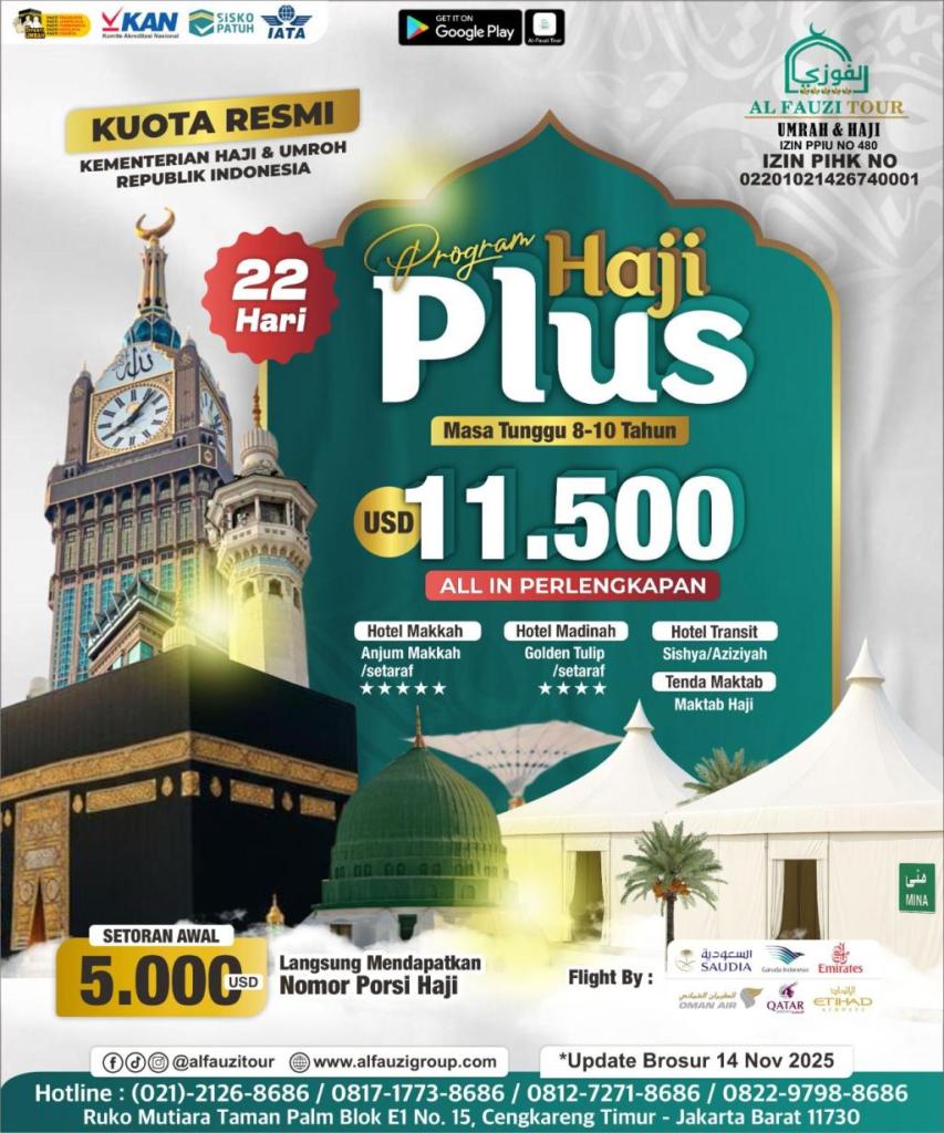Al Fauzi News | Sekarang, daftar Haji Plus lewat Kemenhaj jadi jauh lebih gampang. Cukup siapkan DP dua juta rupiah, kamu langsung mengantongi porsi haji khusus. Skema baru ini benar-benar memudahkan siapa saja yang mau mengamankan antrean berangkat haji tanpa harus keluar biaya besar di awal. Begitu setor DP, nama kamu langsung tercatat di SISKOHAT sebagai peserta Haji Plus.